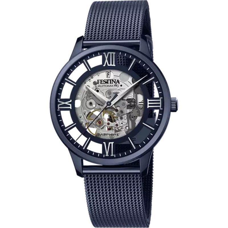Reloj Festina Hombre Automático F20574/1 con esfera transparente que revela el elegante movimiento automático. Correa de malla metálica en azul oscuro y acabado en acero inoxidable. Ideal para hombres que buscan estilo y precisión. Diseño sofisticado con marcadores romanos y cristal transparente para apreciar el mecanismo interno. Un accesorio perf