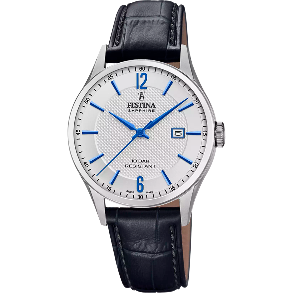 Reloj Festina F20007/2 para hombre con esfera blanca y detalles en azul, correa de piel negra y caja de acero inoxidable. Resistente al agua hasta 10 bar, ideal para uso diario. Diseño elegante y funcional con indicador de fecha. Perfecto para quienes buscan estilo y calidad en un reloj analógico.