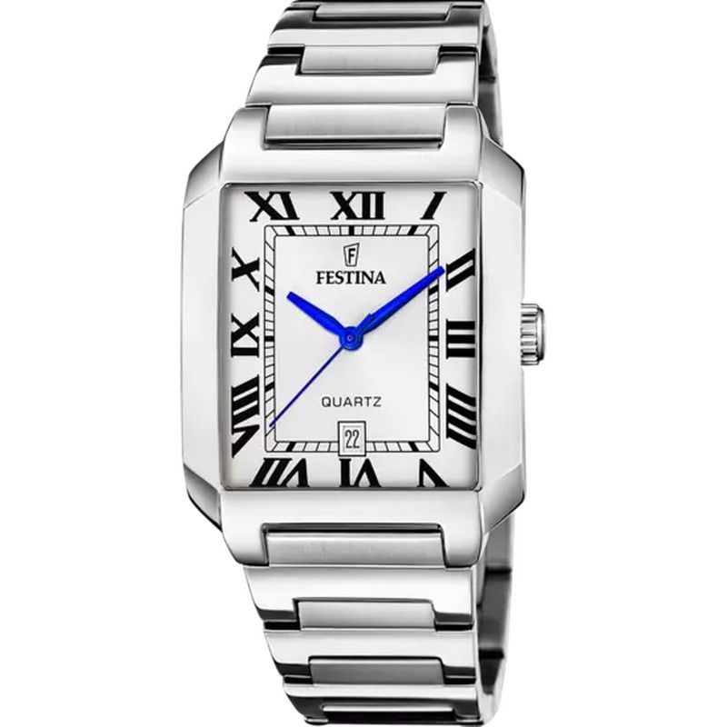 Reloj Festina F20677/1 para hombre con esfera cuadrada blanca y números romanos, manecillas azules y correa de acero inoxidable. Diseño elegante y clásico, ideal para looks formales o diarios. Resistente y de alta calidad, perfecto para adultos que buscan estilo y precisión en un reloj cuarzo.