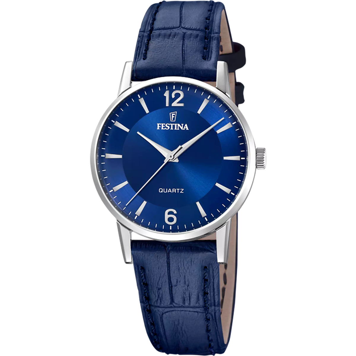 Reloj Festina F20691/4 para mujer con esfera azul y correa de piel azul con textura de cocodrilo. Caja de acero inoxidable y diseño elegante con manecillas plateadas y marcadores blancos. Ideal para looks formales o diarios, combina estilo y funcionalidad. Movimiento de cuarzo para precisión. Un accesorio sofisticado para mujeres que valoran la cal