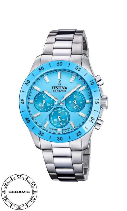 Reloj Festina F20693/3 para mujer con esfera azul cerámica y correa de acero inoxidable. Diseño elegante y deportivo con cronógrafo, resistente al agua hasta 10 BAR. Ideal para mujeres que buscan estilo y funcionalidad en un reloj de alta calidad.