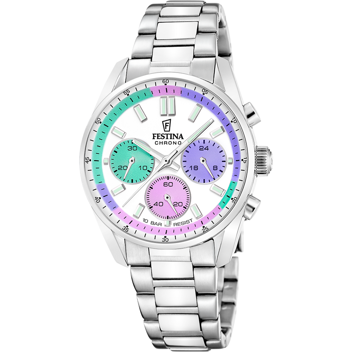 Reloj Festina unisex F20753/5 cronógrafo con esfera blanca y detalles en verde y morado, ideal para adultos que buscan estilo y funcionalidad. Fabricado en acero inoxidable, cuenta con correa metálica pulida y tres subesferas coloridas. Resistente al agua hasta 10 BAR, perfecto para uso diario y ocasiones especiales.
