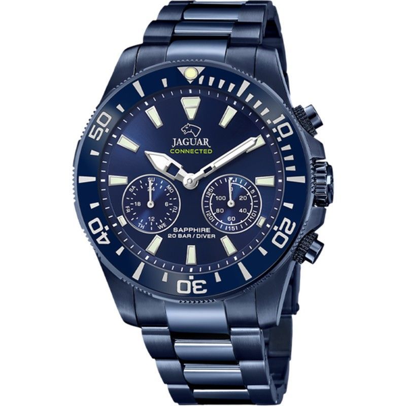 Reloj Jaguar Hombre J930/1 Connected en color azul, con esfera de diseño deportivo y correa de acero inoxidable. Ideal para hombres que buscan estilo y funcionalidad. Cuenta con cristal de zafiro, resistencia al agua de 20 bar y detalles luminosos para una mejor visibilidad. Perfecto para uso diario o actividades acuáticas.