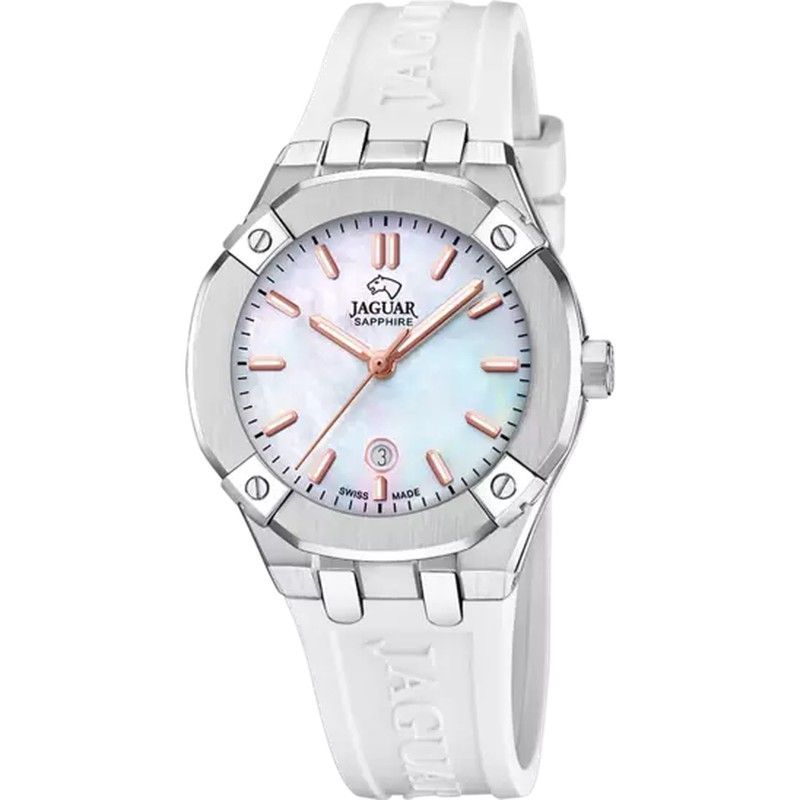 Esfera de madreperla con marcadores en tono rosa doradoCorona lateral con texturaCorrea de goma blanca con grabado del logoDiseño deportivo con bisel octogonalIndicador de fecha a las 3 en puntoLogotipo de jaguar en la esfera
