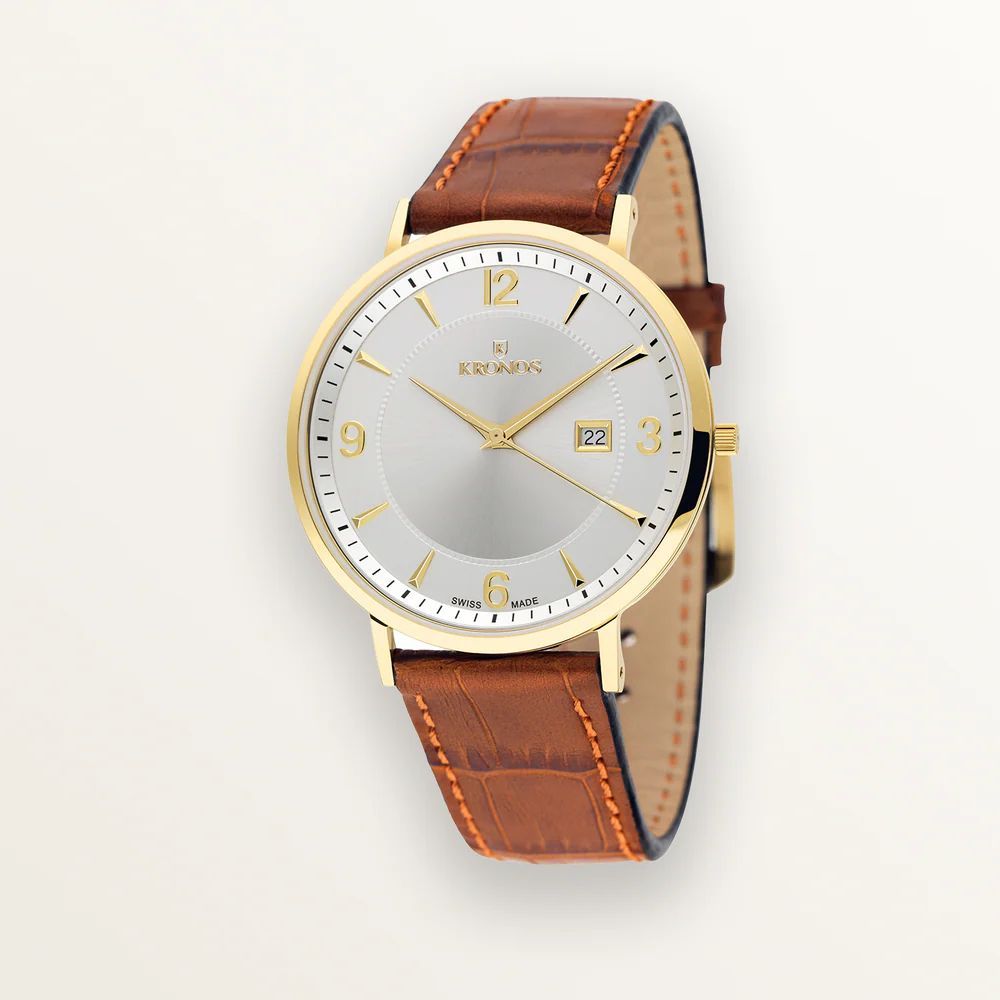 Reloj KRONOS First Class 971.33.19 con esfera plateada y detalles dorados, ideal para hombres que buscan elegancia y precisión. Correa de cuero marrón con costuras finas y acabado pulido. Diseño clásico con indicador de fecha. Perfecto para ocasiones formales o diarias. Calidad suiza, resistente y duradero.