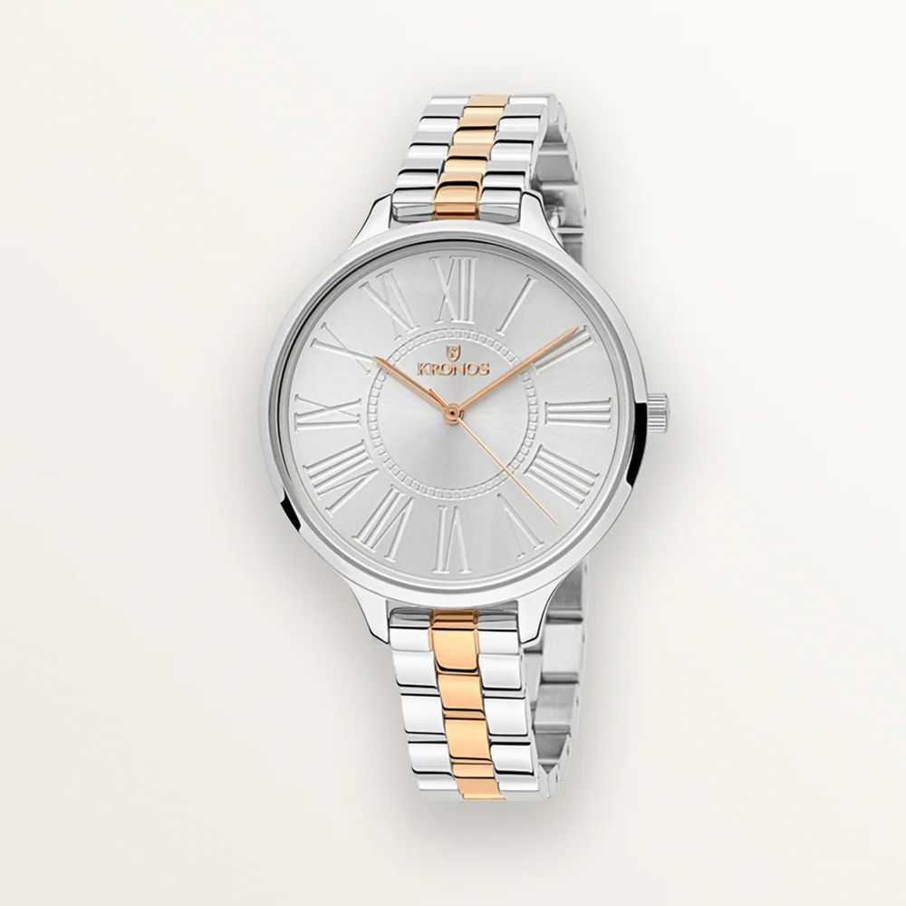 Reloj KRONOS ladies bicolor K023.9.24.19, elegante y sofisticado, ideal para mujeres que buscan un toque de distinción. Con esfera blanca, marcadores romanos y correa bicolor en acero inoxidable plateado y dorado, combina estilo y calidad. Perfecto para ocasiones formales o diarias, este reloj es un accesorio esencial para tu look.