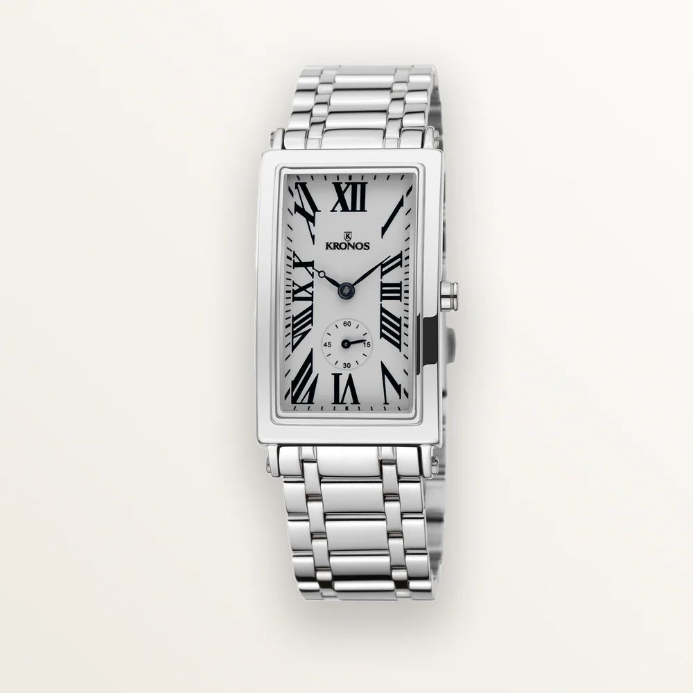 Reloj KRONOS para mujer con elegante diseño rectangular, correa de acero inoxidable y esfera blanca con números romanos negros. Ideal para looks formales o diarios, combina sofisticación y durabilidad. Perfecto para mujeres que buscan un accesorio clásico y de calidad.
