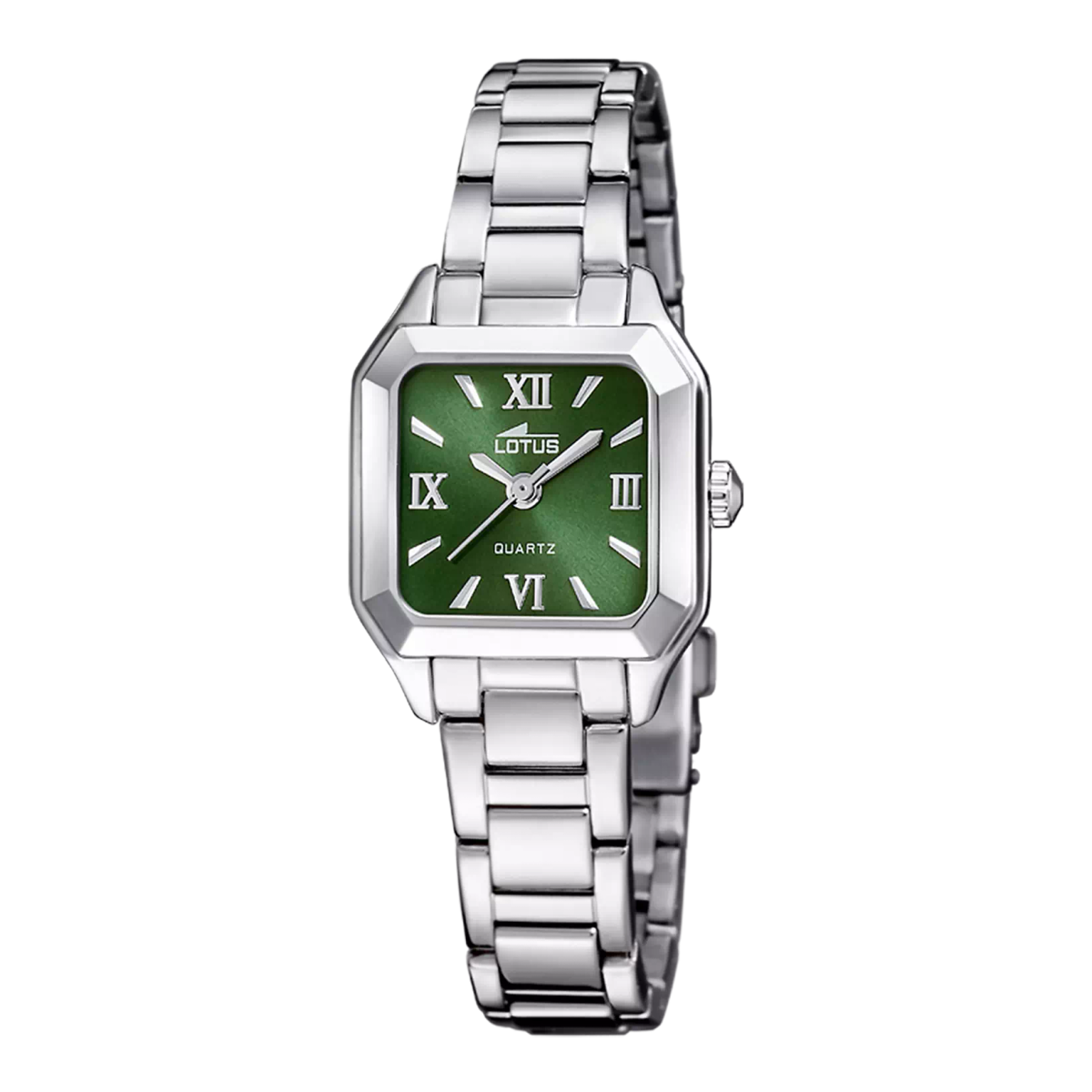 Esfera verde con números romanosCorona lateral para ajustar la horaDiseño rectangular con bordes angularesMarca lotus en la esferaIndicación 'quartz' en la esferaCorrea de eslabones metálicos