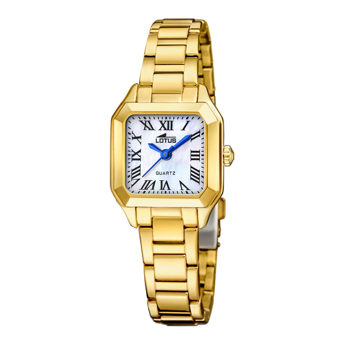 Reloj Lotus Mujer 19037/2 con elegante diseño rectangular y correa de acero inoxidable dorado. Esfera blanca con números romanos y manecillas azules, ideal para looks sofisticados. Resistente y de alta calidad, perfecto para mujeres que buscan estilo y precisión en su accesorio diario.
