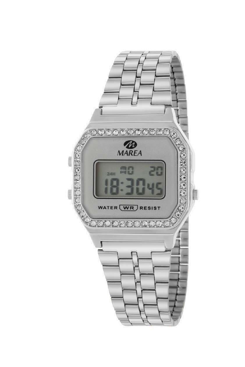 Reloj digital Marea para mujer, modelo B35381/1, con elegante bisel adornado con circonitas y correa de acero inoxidable plateado. Diseño moderno y sofisticado, ideal para looks urbanos y diarios. Resistente al agua, con pantalla LCD clara y fácil lectura. Un accesorio funcional y estético para mujeres que buscan estilo y calidad.