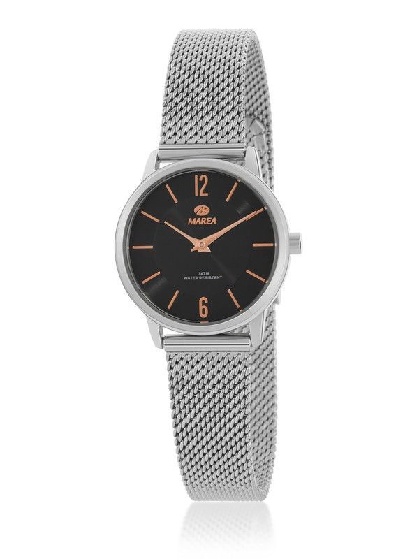 Reloj Marea Mujer B36180/2 con esfera negra y detalles naranja, correa de malla de acero inoxidable plateado. Diseño elegante y minimalista, ideal para mujeres que buscan un accesorio sofisticado y versátil. Resistente al agua hasta 3ATM. Perfecto para uso diario o ocasiones especiales.