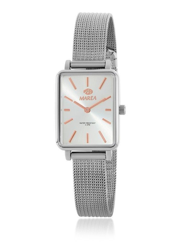 Reloj Marea Mujer B54235/1 con elegante diseño cuadrado y correa de malla metálica en acero inoxidable. Esfera blanca con detalles naranjas y acabado perlado, ideal para looks sofisticados. Resistente al agua hasta 3 ATM. Perfecto para mujeres que buscan estilo y calidad en su accesorio diario.