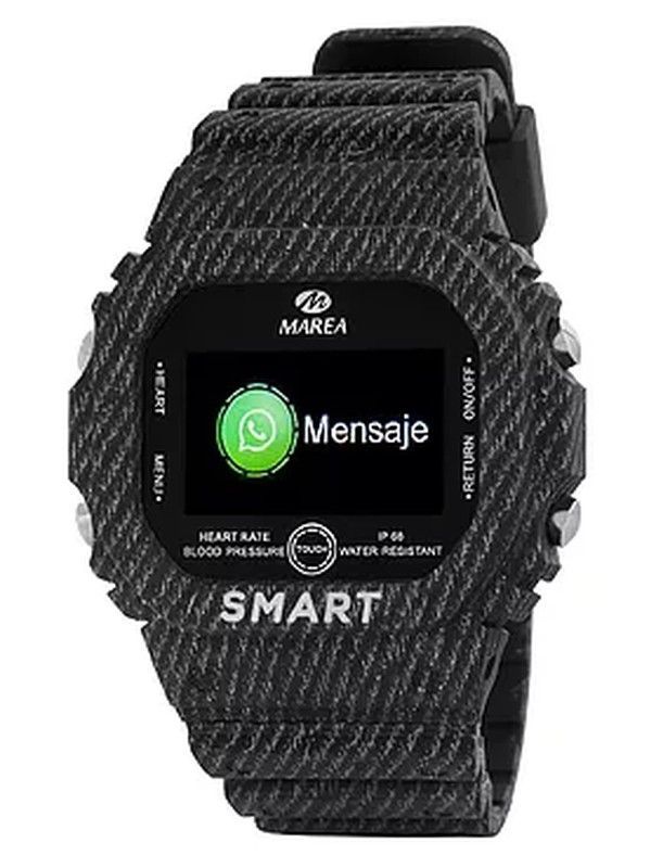 Reloj inteligente Marea Smartwatch B57008/4 Sport Tejano, ideal para adultos activos que buscan estilo y funcionalidad. Con correa textil negra con textura tejana y pantalla táctil, muestra notificaciones de WhatsApp y monitorea frecuencia cardíaca y presión arterial. Resistente al agua, perfecto para el día a día y entrenamientos. Combina tecnolog