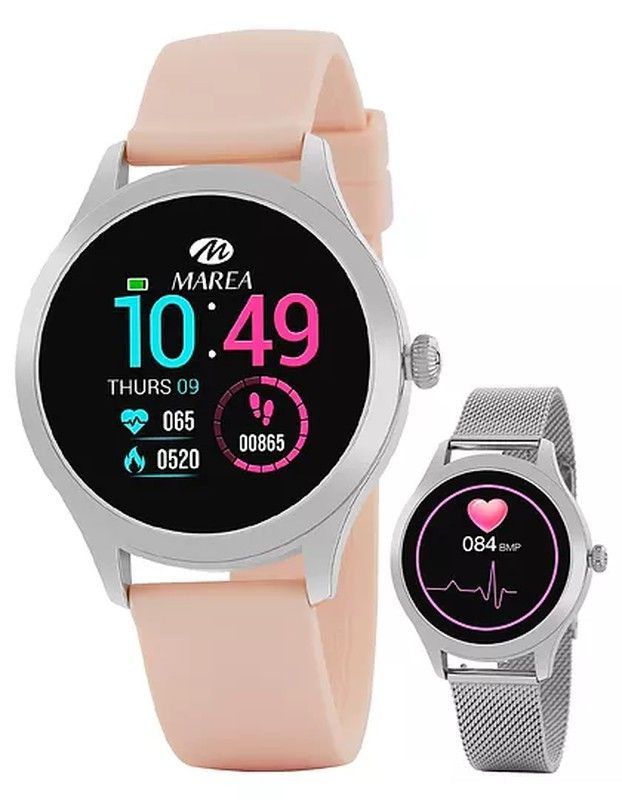 Reloj inteligente Marea B59005/6 con correa de silicona rosa y caja de acero inoxidable. Ideal para adultos que buscan estilo y funcionalidad. Monitoriza pasos, frecuencia cardíaca, calorías y actividad diaria. Diseño elegante y moderno, perfecto para uso diario y deportivo. Incluye versión con correa de malla metálica plateada.