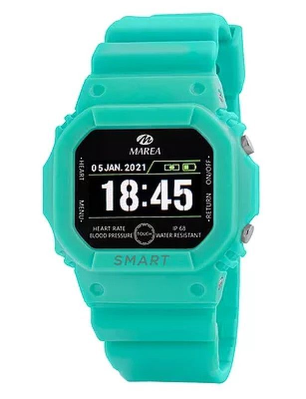 Reloj inteligente Marea Smartwatch B60002/7 Sport en color azul turquesa, ideal para adultos activos que buscan funcionalidad y estilo. Con pantalla digital clara, correa de goma y carcasa de plástico resistente, ofrece seguimiento de ritmo cardíaco, presión arterial y resistencia al agua hasta 10 metros. Perfecto para deportistas y amantes de la t