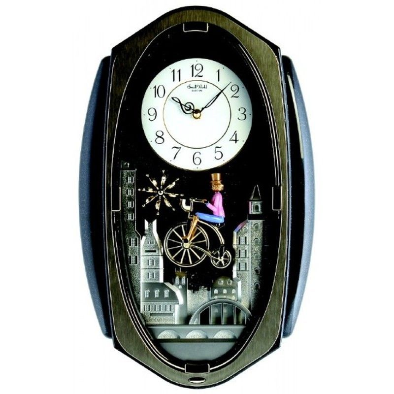 Reloj de pared Rhythm Magic Motion con diseño antiguo y movimiento automático. Ideal para decorar espacios con estilo clásico. Cuenta con una escena de ciclista en ciudad que gira al sonar la campana. Fabricado con materiales de calidad como metal y vidrio, con acabado negro mate y detalles plateados y dorados. Perfecto para salones, oficinas o rin