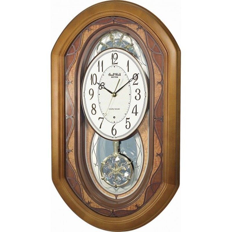 Reloj de pared Rhythm modelo 4MJ887WR06, con diseño clásico y elegante. Cuerpo de madera en tono marrón, esfera blanca con números negros y manecillas doradas. Incluye péndulo decorativo con cristales facetados y detalles de vidrio en los laterales. Ideal para decorar salones, comedor o oficinas con estilo tradicional. Fácil instalación y funcionam
