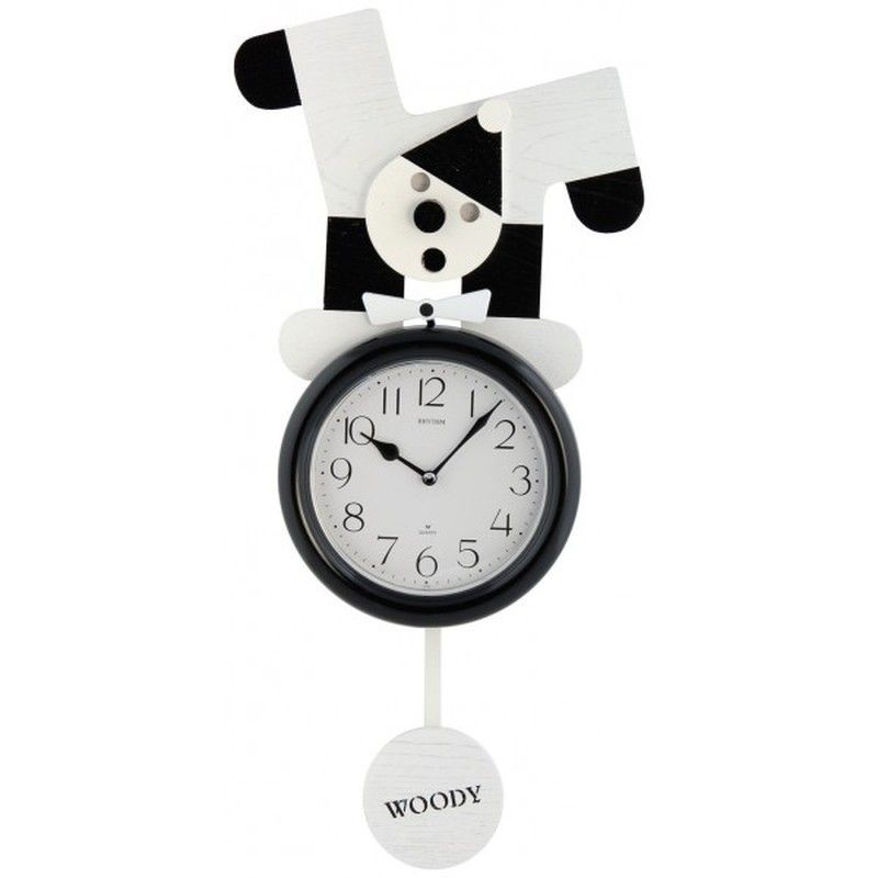 Reloj de pared decorativo Rhythm con diseño de perro en blanco y negro, ideal para habitaciones infantiles o espacios con estilo divertido. Fabricado en madera, cuenta con esfera redonda clara y péndulo con la inscripción 'WOODY'. Un toque original y funcional para decorar con estilo.