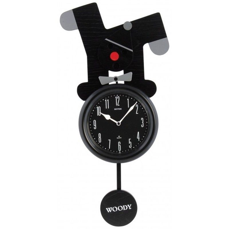 Reloj de pared decorativo Rhythm con diseño de personaje de perro en traje negro, ideal para decorar salas, comedores o espacios infantiles. Fabricado en madera y metal, con detalles en gris y rojo. Incluye péndulo con la inscripción 'WOODY'. Estilo moderno y divertido para añadir un toque único a tu hogar.
