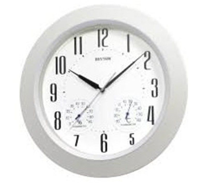 Reloj de pared Rhythm CFG712NR03 con diseño elegante y minimalista, ideal para decorar cualquier espacio de tu hogar. Cuerpo redondo con marco plateado y esfera blanca con números negros, fácil de leer. Incluye indicadores de temperatura y humedad. Fabricado en metal y vidrio, resistente y duradero. Perfecto para salones, cocinas o oficinas.
