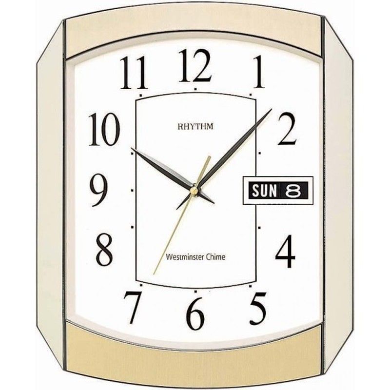 Reloj de pared Rhythm CFH102NR65 con diseño rectangular y acabado dorado, ideal para decorar salones, comedor o oficinas. Esfera blanca con números negros y manecillas elegantes, incluye indicador de día y fecha. Fabricado con materiales de calidad como metal y vidrio, ofrece un toque clásico y sofisticado a cualquier espacio. Perfecto para quienes