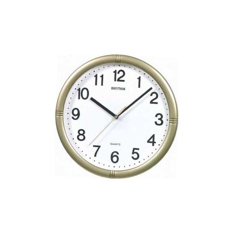 Reloj de pared Rhythm CMG434BR con diseño redondo y marco dorado, ideal para decorar salas, comedor o oficinas. Esfera blanca con números negros y manecillas elegantes. Fabricado con materiales de calidad como metal y vidrio, ofrece precisión y estilo. Perfecto para quienes buscan un toque clásico y sofisticado en su hogar o espacio de trabajo.