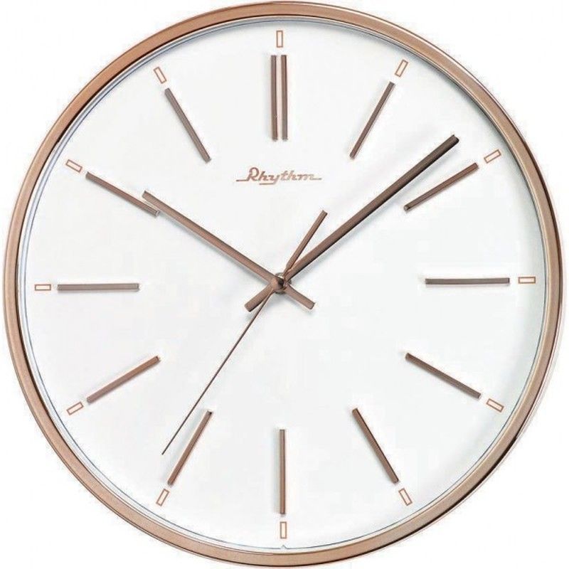 Reloj de pared Rhythm CMG437NR13 con diseño elegante y minimalista, ideal para decorar salones, comedor o oficinas. Esfera blanca con marco metálico rosado y manecillas delgadas en tono marrón. Fabricado con materiales de calidad como metal y vidrio, ofrece una combinación perfecta entre estilo y funcionalidad. Aporta un toque sofisticado a cualqui