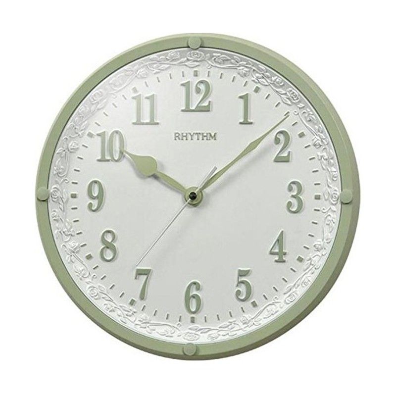 Reloj de pared Rhythm CMG515NR05 con diseño decorativo y elegante. Ideal para decorar salas, cocinas o dormitorios. Cuenta con marco verde, esfera blanca con números verdes y detalles florales en relieve. Fabricado en plástico y metal, ofrece una combinación de estilo y funcionalidad. Perfecto para amantes de la decoración clásica y sofisticada.
