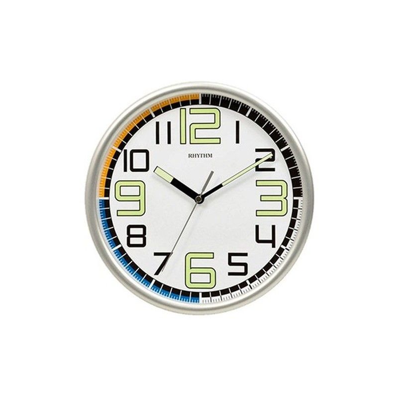Reloj de pared Rhythm CMG596NR19, diseño redondo y elegante con marco plateado y esfera blanca. Números grandes en verde y detalles en naranja y azul para una fácil lectura. Ideal para decorar salas, oficinas o cocinas con estilo moderno. Fabricado con materiales duraderos como metal y plástico. Un accesorio funcional y decorativo para cualquier es