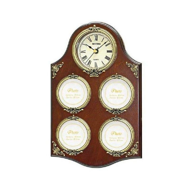 Reloj de pared Rhythm CMG962NR06 con elegante diseño decorativo en madera marrón y detalles dorados. Incluye cuatro portafotos circulares para personalizar con tus recuerdos. Ideal para decorar salas, comedor o pasillos con estilo clásico y sofisticado. Combina funcionalidad y estética en un solo producto.