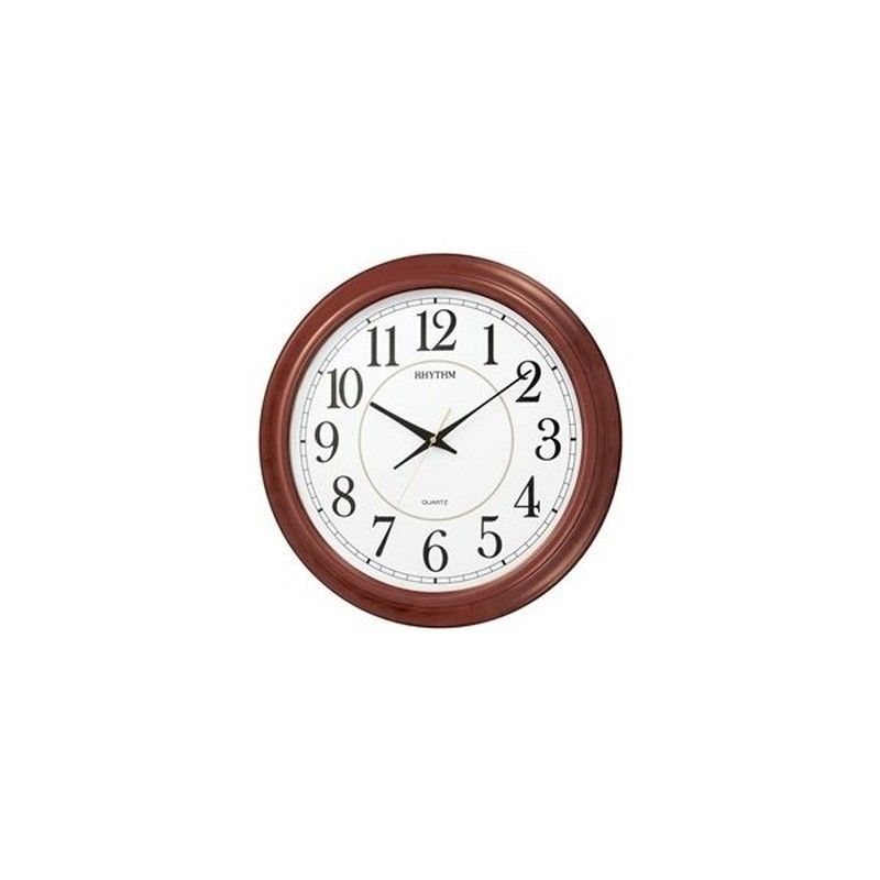 Reloj de pared Rhythm CMG982NR06 con diseño redondo y marco de madera marrón. Esfera blanca con números negros y manecillas clásicas. Ideal para decorar salas, comedor o oficinas con estilo elegante y funcional. Fácil instalación y lectura precisa del tiempo.