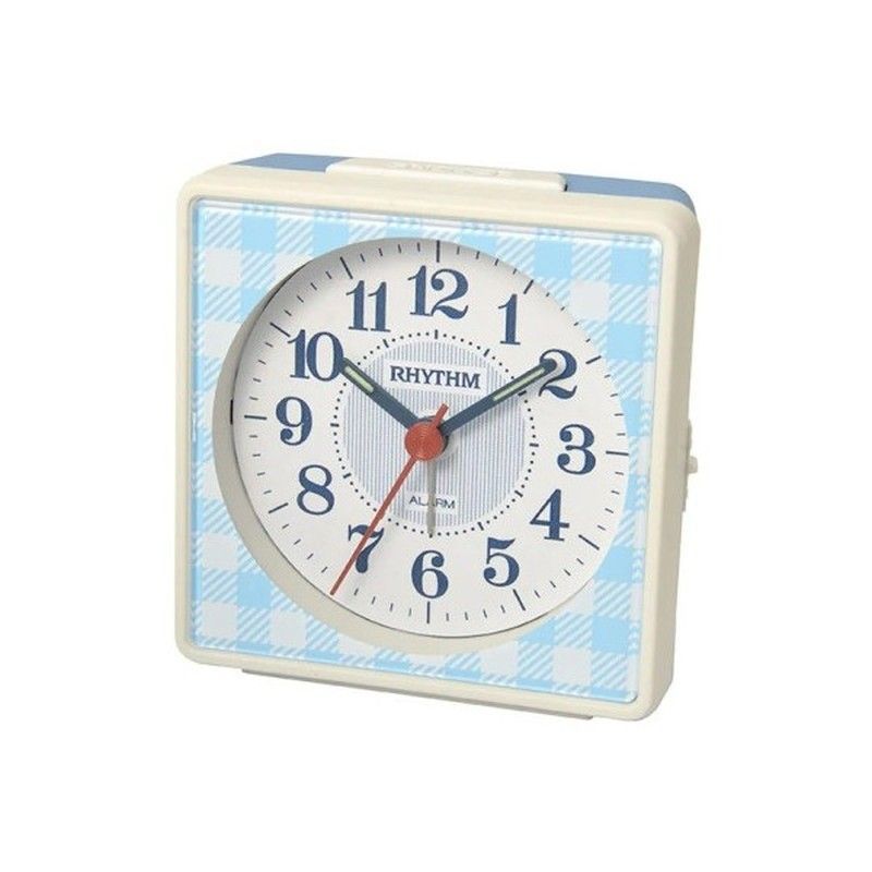 Reloj despertador Rhythm CRE310NR74 con diseño bicolor azul y blanco, ideal para dormitorios o mesitas de noche. Cuenta con esfera clara, manecillas nítidas y marco con estampado de cuadros. Fabricado en plástico resistente, ofrece una alarma clara y funcional. Perfecto para adultos que buscan un despertador elegante y práctico.