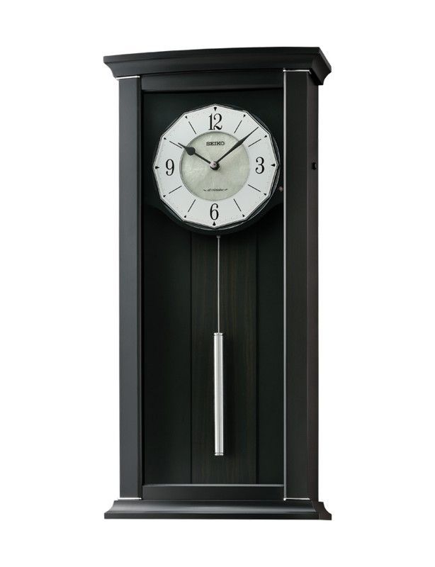 Reloj de pared Seiko QXM605K en acabado negro, ideal para decorar salones, comedor o oficinas con estilo clásico. Fabricado con madera y metal, presenta una esfera blanca con números negros y un péndulo metálico visible que añade elegancia. Su diseño sofisticado y funcional lo convierte en un accesorio decorativo y práctico para cualquier hogar.