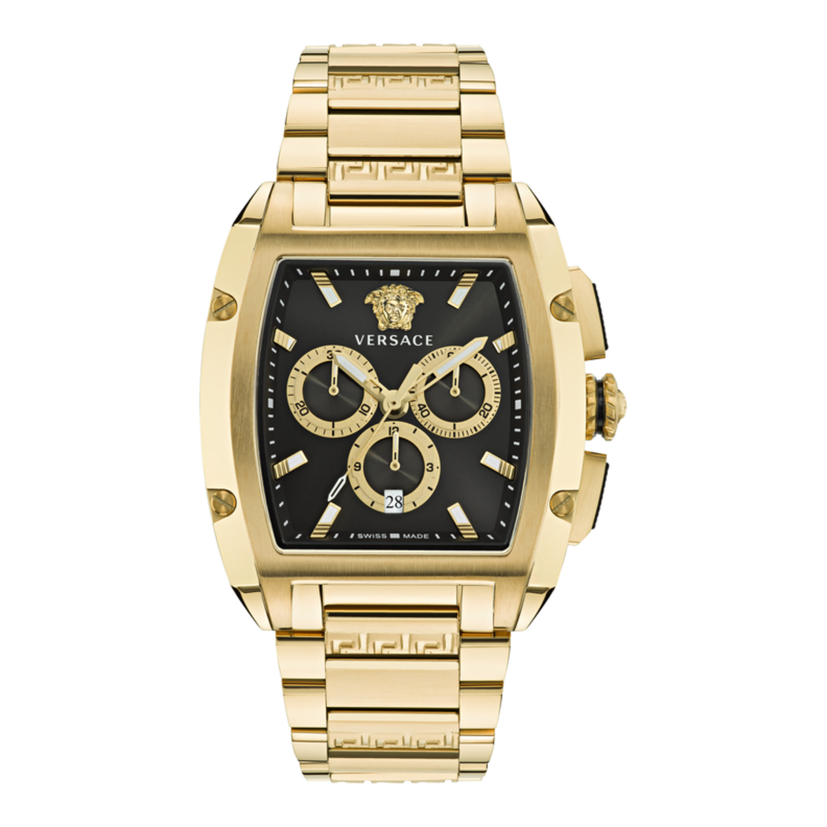 Reloj Versace Hombre VE6H00523 Dorado Dominus, elegante y sofisticado, con esfera negra y detalles dorados. Fabricado en acero inoxidable con correa metálica y diseño Greca. Ideal para hombres que buscan un accesorio de lujo con funcionalidad cronógrafo. Perfecto para ocasiones formales o diarias con estilo.