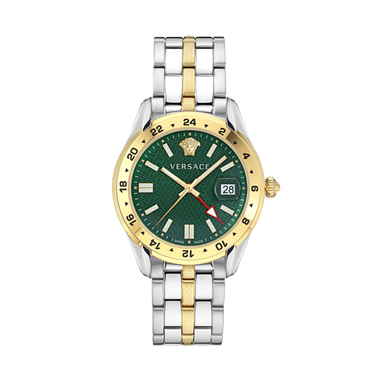 Reloj Versace Hombre VE7C00623 con esfera verde Greca y correa bicolor en acero inoxidable y metal dorado. Diseño elegante y sofisticado con función GMT y indicador de fecha. Ideal para hombres que buscan estilo y precisión en su accesorio diario. Calidad premium y acabados refinados para un look urbano y moderno.
