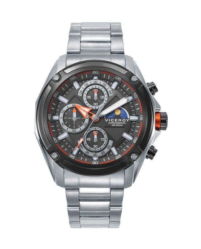Reloj Viceroy Hombre 401443-17 con correa de acero inoxidable y esfera negra con detalles naranja. Cronógrafo con tres subesferas, ideal para hombres que buscan estilo y funcionalidad. Resistente al agua hasta 100 metros. Diseño moderno y robusto para uso diario o ocasiones especiales.