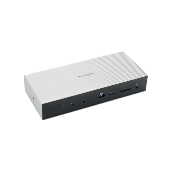 Replicador de puertos 4K Triple SD5000T5 EQ Thunderbolt 5 en acabado blanco y gris, diseñado para profesionales y usuarios avanzados que necesitan expandir sus conexiones. Conecta múltiples dispositivos con alta velocidad y resolución 4K. Ideal para ordenadores portátiles y estaciones de trabajo. Fabricado con plástico y metal para mayor durabilida