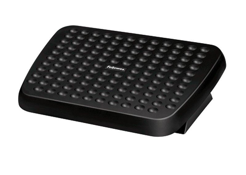 Reposapiés ergonómico ajustable en color negro, fabricado en plástico resistente. Ideal para mejorar la postura al trabajar en el ordenador, con superficie antideslizante con textura de bolas para mayor comodidad y estabilidad. Incluye pie de apoyo regulable para adaptarse a diferentes alturas de escritorio. Perfecto para oficinas y espacios de tra