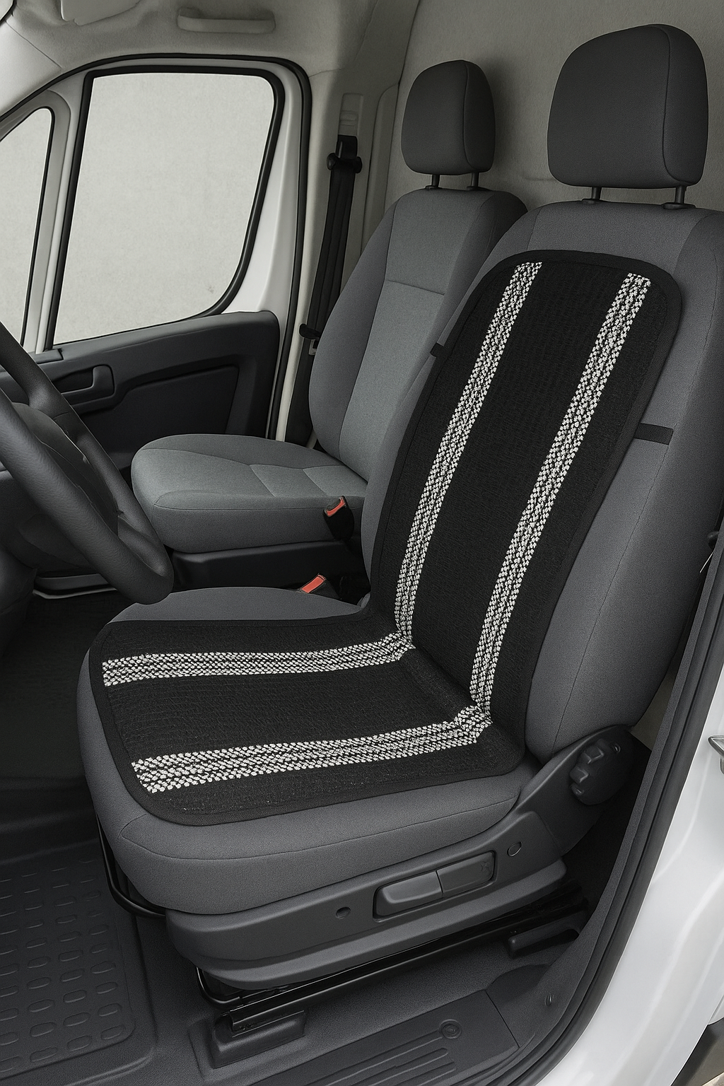 Cojín para respaldo de asiento de vehículo 'Don Fresco' Black, ideal para conductores y pasajeros que buscan comodidad y transpirabilidad. Fabricado en poliéster y algodón con diseño de rayas blancas sobre fondo negro, ofrece un ajuste seguro gracias a sus cintas laterales. Perfecto para largos trayectos, mejora la ventilación y protege el asiento
