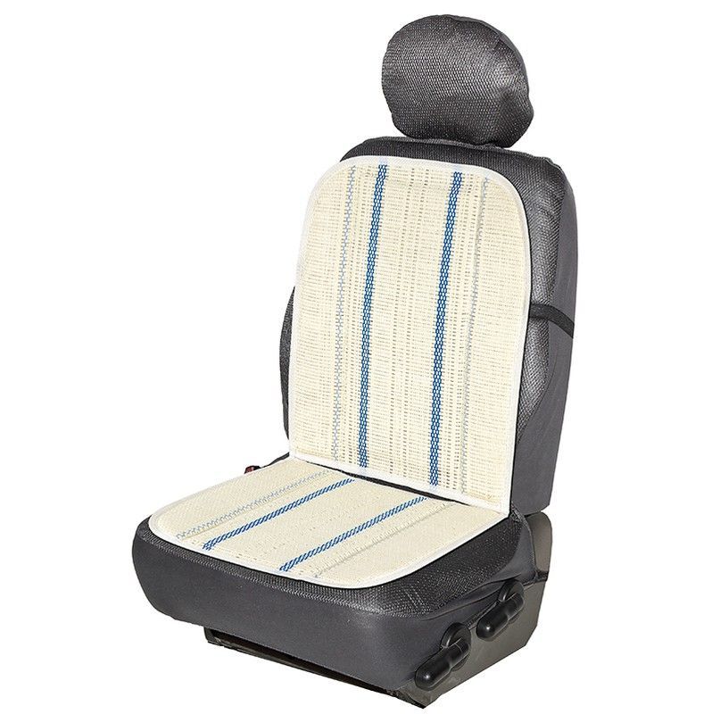 Respaldo RAFIA 'ICE' para asiento de vehículo, con diseño elegante en tejido de rafia blanco con rayas azules. Ideal para adultos que buscan comodidad y estilo en su coche. Fabricado con materiales resistentes y transpirables, perfecto para climas cálidos. Incluye apoyo lumbar y reposacabezas integrado para mayor confort durante el viaje.