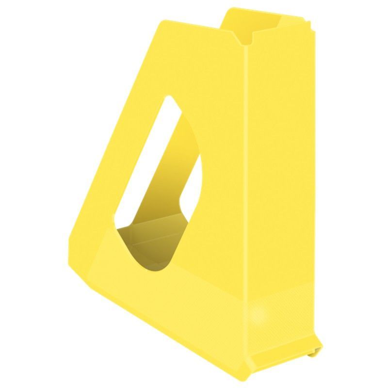 Revistero Europost en color amarillo vivido, fabricado en plástico opaco. Ideal para organizar revistas, documentos o folletos en oficinas, salas de espera o espacios de trabajo. Diseño triangular con abertura central para fácil acceso. Base estable con pies antideslizantes para mayor seguridad. Solución práctica y funcional para mantener tu espaci