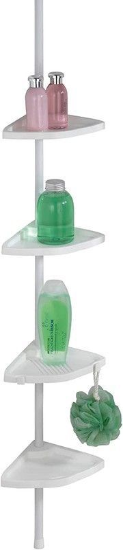 Estantería rinconera telescópica Wenko Easy en blanco, ideal para optimizar el espacio en el baño o ducha. Fabricada en plástico resistente, cuenta con cuatro niveles triangulares ajustables en altura y un práctico gancho para esponja. Perfecta para organizar productos de higiene como champú, gel o jabón, manteniendo el baño ordenado y funcional.