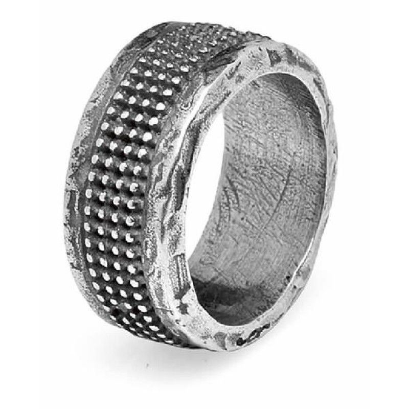 Anillo unisex RM2 en plata de palo con acabado antiguo y diseño industrial. Destaca por su banda central decorada con puntos y textura rugosa, ideal para quienes buscan joyería con estilo robusto y atemporal. Fabricado en plata de alta calidad, perfecto para uso diario o como pieza de declaración.