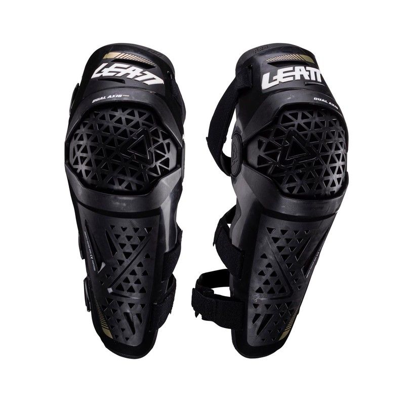 Rodilleras y espinilleras Leatt Dual Axis Pro en negro con detalles dorados, diseΓ±adas para ciclistas que buscan protecciΓ³n total sin sacrificar la movilidad. Fabricadas con plΓ‘stico resistente, textil transpirable y goma en puntos de contacto, ofrecen una ventilaciΓ³n Γ³ptima gracias a su estructura de malla triangular. Ideal para ciclismo de montaΓ±