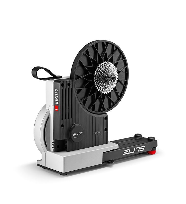 Rodillo de entrenamiento ELITE JUSTO 2 para ciclismo en interior. Diseño robusto y compacto con acabado en negro y blanco, ideal para ciclistas que buscan mejorar su rendimiento en casa. Fabricado con materiales de alta calidad como plástico y metal, ofrece estabilidad y precisión. Perfecto para entrenamientos intensivos y control de resistencia. I