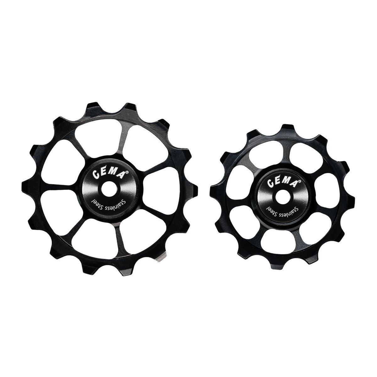 Roldanas Cema 10/11V en aluminio y acero, acabado negro, ideales para bicicletas de montaña y carretera. Diseño ligero con múltiples aberturas para mayor eficiencia y durabilidad. Compatible con sistemas de 12 a 14 dientes. Calidad profesional para ciclistas exigentes.