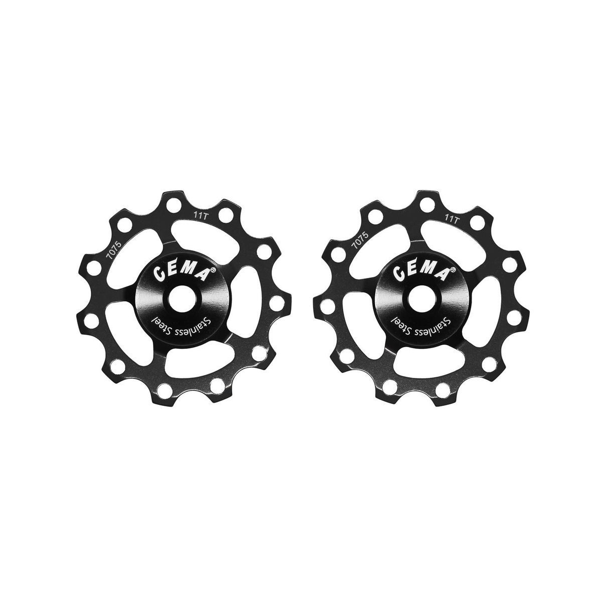 Roldanas Cema de 11 dientes para bicicletas, fabricadas en aluminio y acero para mayor resistencia y ligereza. Ideales para ciclistas que buscan rendimiento y durabilidad. Diseño perforado para reducir el peso sin sacrificar la fuerza. Compatible con sistemas de 9/10/11 velocidades. Perfectas para ciclismo de montaña y carretera.