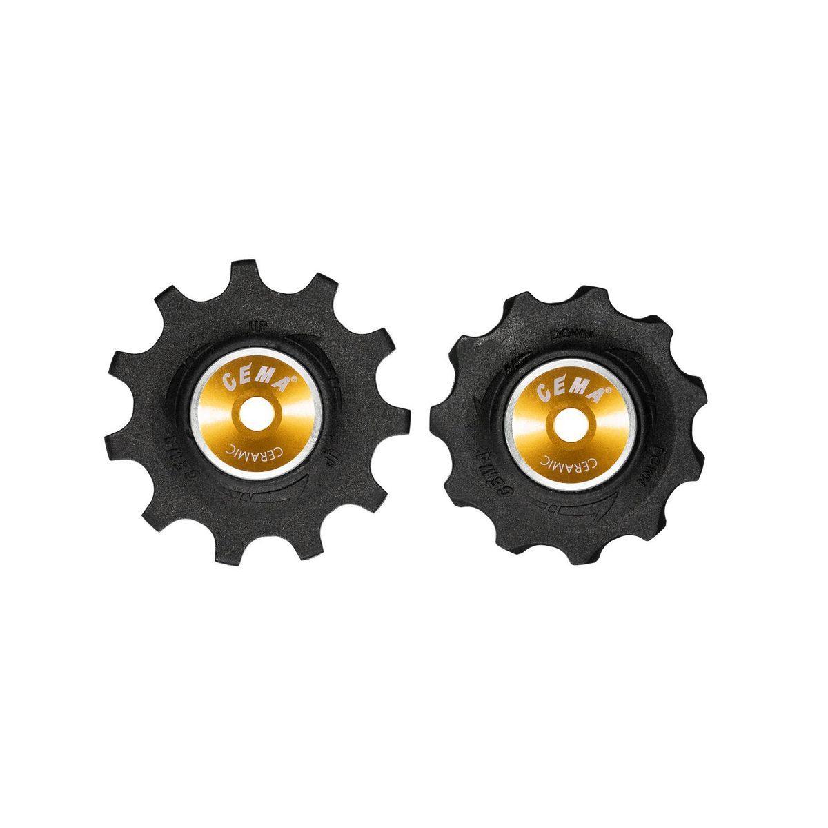 Roldanas CEMA para bicicletas de 9/10/11 velocidades, con diseño de engranaje en negro y cerámica dorada, ideales para ciclistas de todos los niveles.