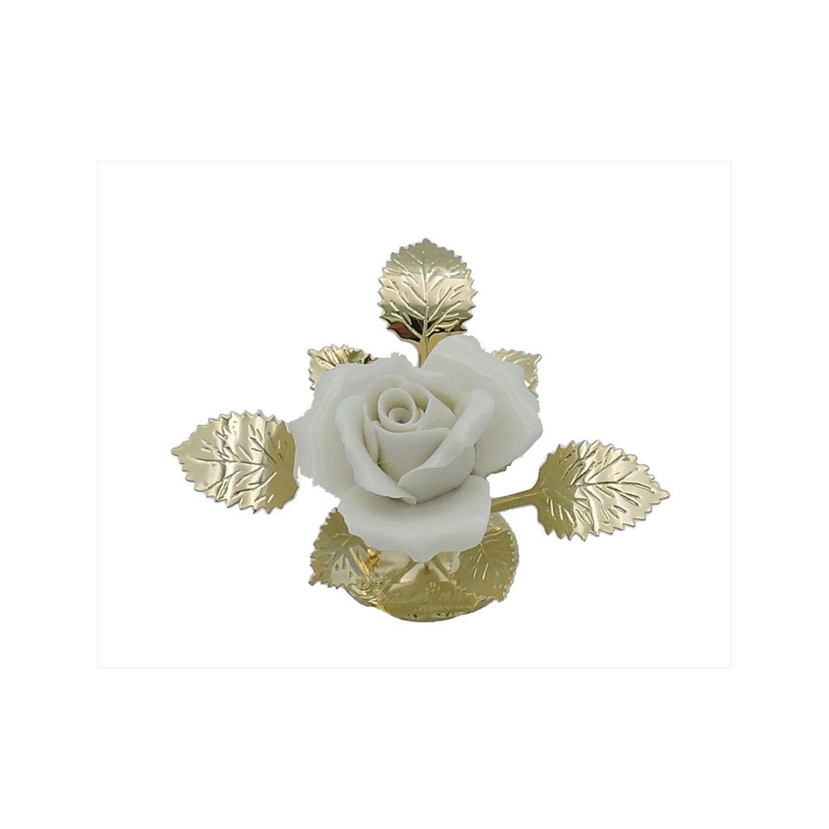 Rosa decorativa blanca con hojas doradas, ideal para adornar espacios elegantes. Fabricada con resina de alta calidad y detalles metálicos dorados, esta pieza de 7 cm aporta un toque sofisticado a cualquier decoración. Perfecta para centros de mesa, eventos especiales o como regalo con significado. Combina belleza natural con diseño refinado.