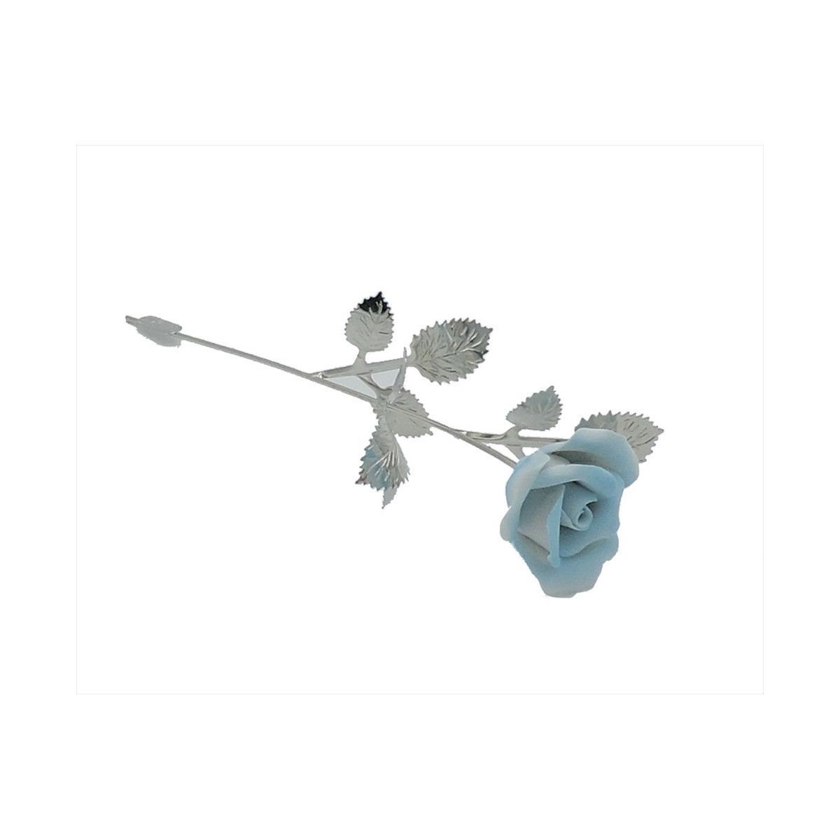 Rosa artificial de 26 cm con tallo metálico plateado y hojas decorativas, en color celeste. Ideal para decoraciones festivas, centros de mesa o arreglos estacionales. Hecha con materiales de calidad que imitan la textura real de la flor. Perfecta para añadir un toque elegante y duradero a cualquier espacio.